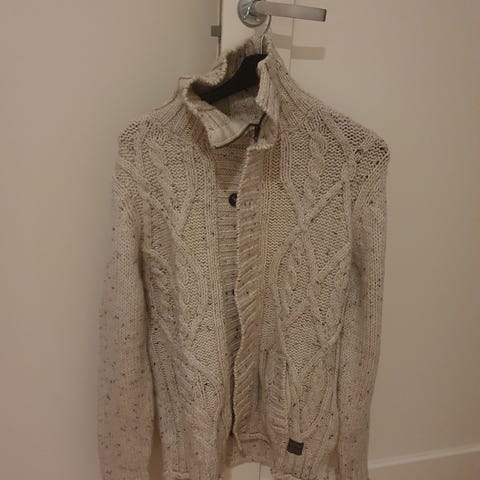 Beige herregenser i størrelse M med mønster i kontrastfarger. Genseren har rund hals med kort knappestolpe og to knapper foran. Langermet modell med trykket eller vevd mønster rundt bryst og ermer. Passer til hverdagsbruk og kan kombineres med både jeans og chinos. Materiale er ikke oppgitt på lappen og bør derfor kontrolleres ved behov.