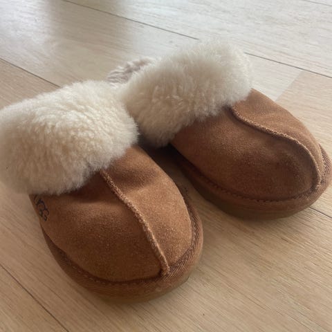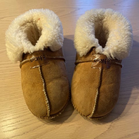 UGG barnesko mokkasiner i størrelse 31 for unisex. Skoene er laget i brun semsket skinn med mykt, fôret innside. De har snøredetalj foran og gummisåle med mønster for bedre grep. Egnet som innesko eller lette utesko i kjøligere vær.