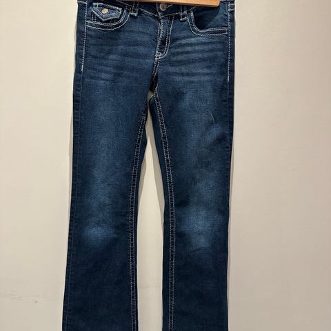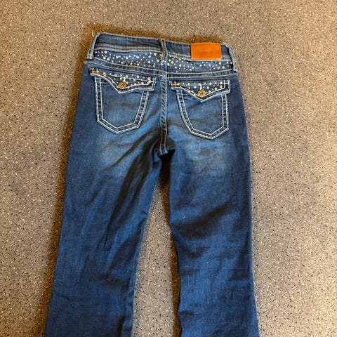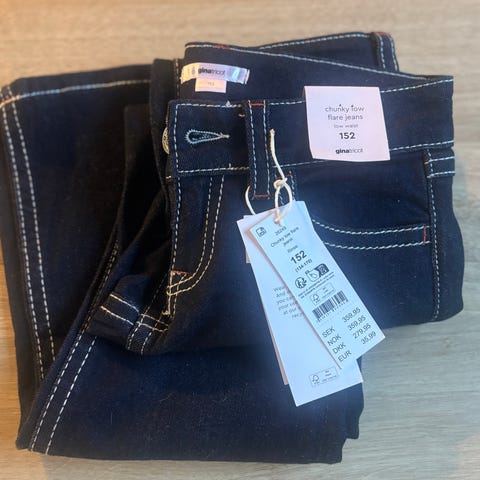 Gina Tricot jeans DECORATED LOW FLARE JEANS i størrelse 152. Buksen er laget i blå denim med vaskede detaljer. Mulighet for regulering i livet med strikk og knapper på innsiden.