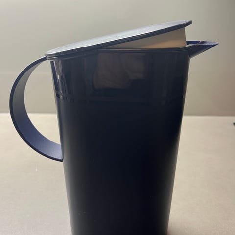 Tupperware mugger med lokk i plast i blå farge. Settet består av én stor og én mindre mugge, begge med hank og lokk. Egnet til servering og oppbevaring av kalde drikker som vann, saft eller juice. Muggene har flat bunn og kan plasseres i kjøleskap. Lokket kan tas av for enkel rengjøring og påfylling.