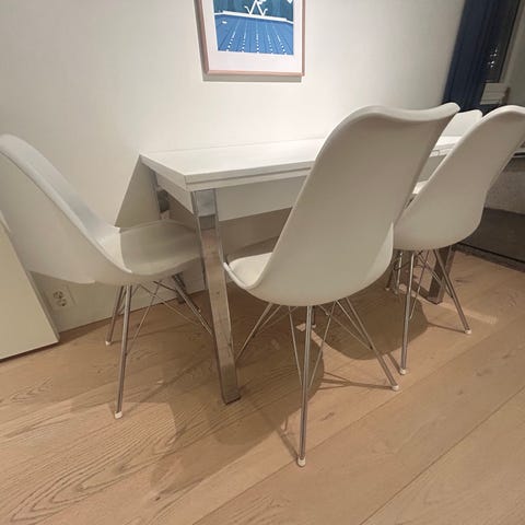 Selger hvitt høyglans spisebord fra Skeidar. Kjøpt nytt og brukt i ca. 5 år.