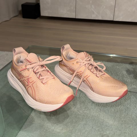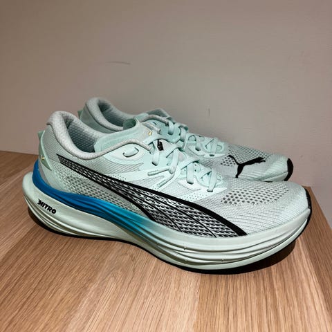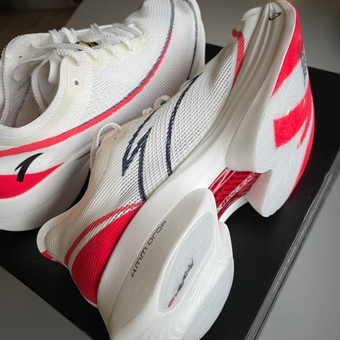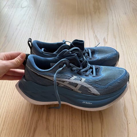 Pent bruk asics megablast som er løpt med bare ca 70-90 km. Litt flass på sålen (se bilde). Svært fornøyd, men selges da de er litt for små for meg. Meget allsidig og responsiv, selv uten karbonplate, og som passer bra til tempo, intervall og langtur. Ingen vond lukt.