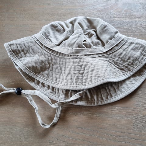 Solhatt i grå farge. Ubrukt. Hatten har justerbar stramming bak for bedre passform . Egnet som solbeskyttelse ved tur, strand og annet utendørsbruk.