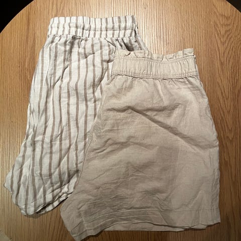 H&M shorts for dame i størrelse S. Shortsene kommer i flerfargede toner, med én lys variant og én mørkere. De har elastisk linning og sidelommer for enkel og komfortabel passform. Egnet til hverdagsbruk og fritid i varme perioder. Den ene shortsen er lin