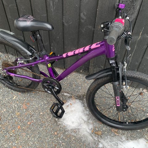 White barnesykkel med 20" hjul. Sykkelen har lilla ramme med kontrastdetaljer, rette styre og felgbremser foran og bak. Utstyrt med skjermer bak og grove dekk som egner seg til bruk på asfalt og lett grus. Passer typisk til barn som bruker 20" hjulstørrelse.