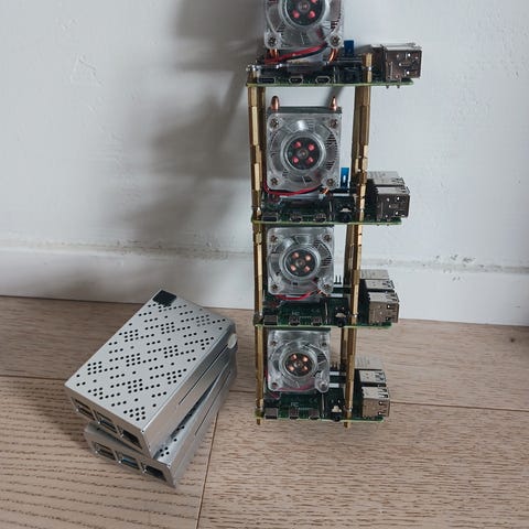 3 stk Raspberry Pi (modell 1–2), den ene har en 2.5 touch skjerm montert