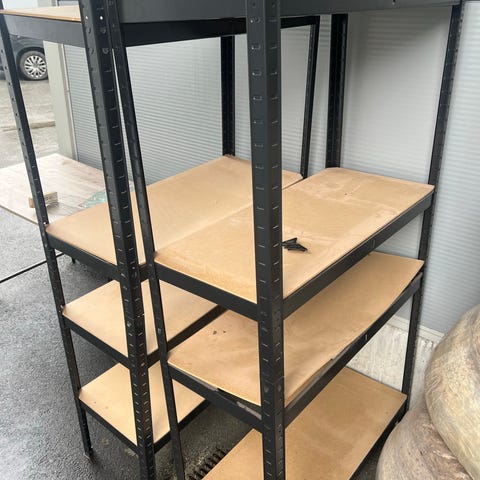 Hylleseksjon i metall med plater i mdf. Egnet som lagringshylle i bod, garasje eller kjeller. Stått tørt i kjellerbod de siste årene, men selges nå pga annen prioritering av plassen. Noen riper, men kun kosmetisk. Selges demontert.