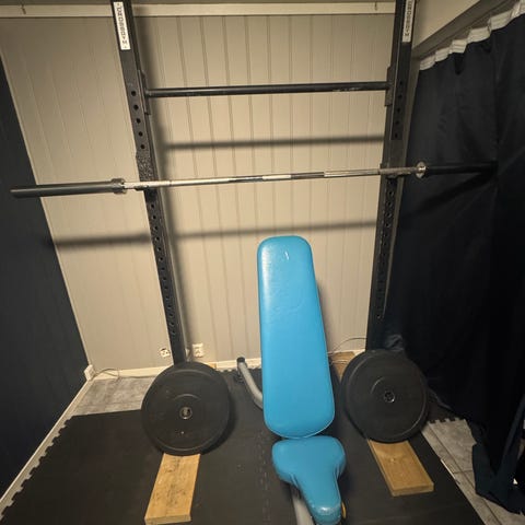 Et godt startsett for hjemmetrening som inneholder benk, stativ for benkpress, vektstang, vekter og manualer selges