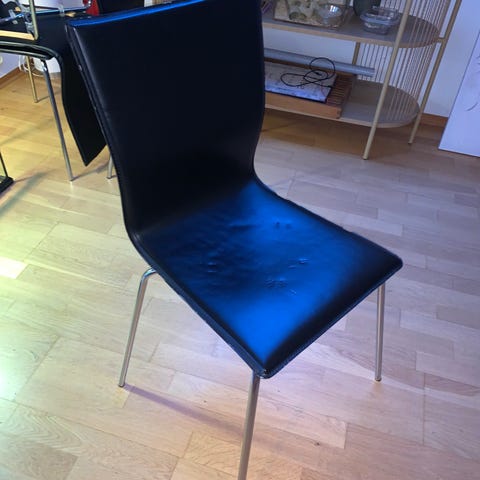 4 stoler i skinn. Skinnet er helt og fint, men beina har litt merker.