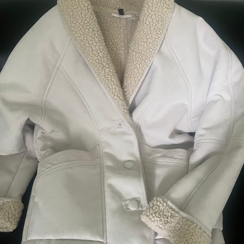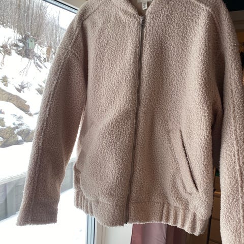 H&M jakke for dame i størrelse S./M. Jakken er i beige polyester med teddy og krage. Semsket for. Den har markerte sømmer og rett passform. Egnet som ytterjakke i overgangssesonger eller milde vinterdager.