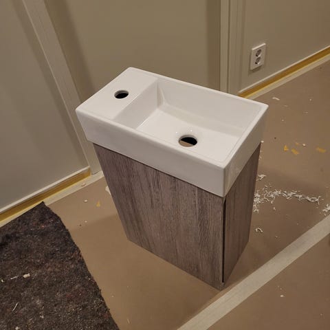 Vasken er nylig impregnert og er helt strøken, kun noen få merker på kanten etter at den har stått oppreist.