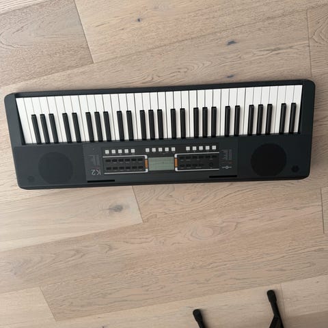 Casio SA-77 keyboard i svart. Modellen har 44 tangenter og innebygd høyttaler. Panelet har display, flere funksjonsknapper og ulike lyd- og rytmevalg. Egnet som kompakt keyboard til øving og enkel musikkspilling. Strømkabel vises på bildet.