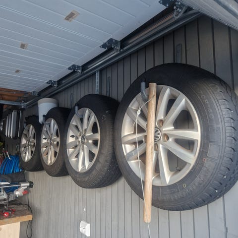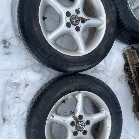 Gamle hjul + vinterdekk med pigger til Golf 4, Polo eller tilsvarende VW folkevogn med 100mm festehull i midten. Tipper dekka er rundt 8år, men lite brukt. Stått ubrukt 2år i garasje. Lekker ikke luft.