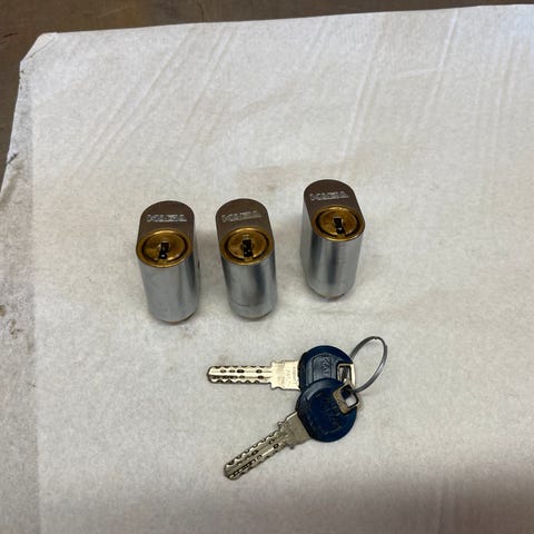 Låssylinder 1220 i matt messing. Leveres med 3 tilhørende nøkler som vist på bildet. Egner seg for bruk i dører der det kreves sylinderlås med messingutførelse.