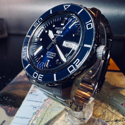Klokken tåler vann ned til 500 meter og leveres med en titanlenke med foldespenne og sikkerhetslås i stål, samt et patentert utvidelsessystem. En ekstra blå gummirem med spenne og forlengelsesstykke følger også med.