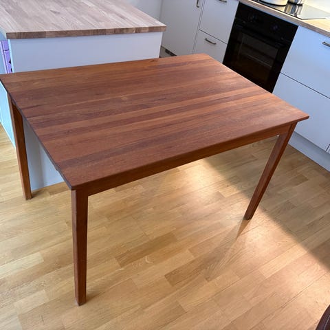 Spisebord i brunt treverk med uttrekksfunksjon. Bordet har rektangulær bordplate og slanke, rette ben. Uttrekksløsningen gjør at bordet kan forlenges ved behov - 188cm totalt Bredde med den. Passer som spisebord i kjøkken eller stue. Stoler på bildene er separate og ikke nødvendigvis inkludert. Teak. Kan ta uten stolene.
