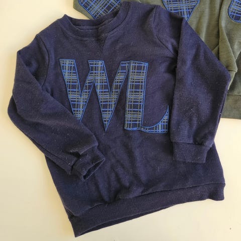 -En blå trøye med flere reperasjoner, 3 blå små stjerner sydd på og sydd rift. Bonusplagget i pakken.