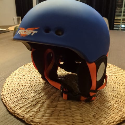 Frost V4 skihjelm i størrelse S. Hjelmen er blå med grafiske detaljer på sidene. Den har ørebeskyttelse med ventilasjon og justeringshjul bak for bedre passform. Egnet som skihjelm eller snowboardhjelm.