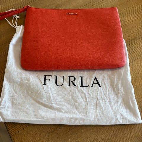 Furla clutch veske i lær for dame. Vesken består av to separate clutch-/pouch-deler, én i svart og én i beige, begge med glidelåslukking. Yttermaterialet er glatt lær. Passer til oppbevaring av småting som nøkler, mobil og kort, eller som enkel clutch til hverdags- og penere antrekk. Diskré Furla-logo på den svarte vesken.