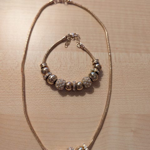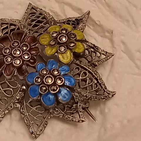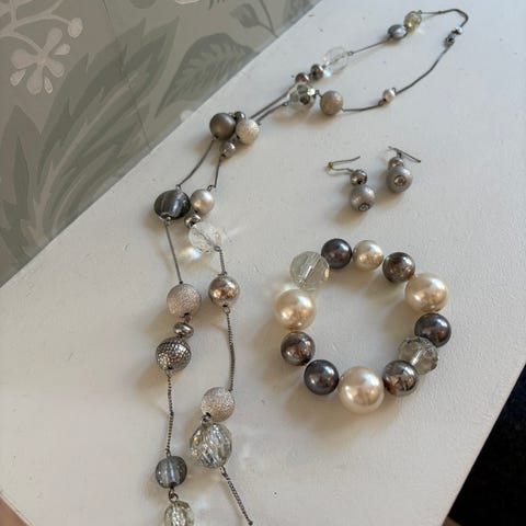 Ørepynt og armbånd til dame i sølvfarget metall med flerfarget blomsterdekor. Sett består av et bredt, åpent armbånd og runde øredobber med hull i midten. Begge deler har emaljelignende blomster- og bladmønster i blant annet turkis, rosa og lyse farger. Passer som tilbehør til hverdags- og penklær.