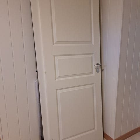 Hvit innerdør med klassisk profilert design og tre speil. Døren har glatt overflate og er egnet til bruk innendørs mellom rom. Standard dørvrider og låskasse er montert. Det kan være mindre merker i overflaten, se bilder for detaljer.