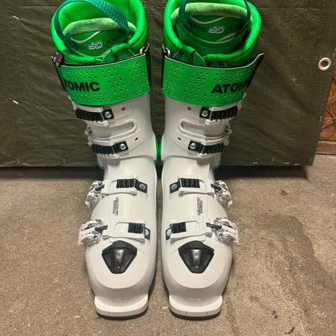 Støvlene er hvite med svarte og blå detaljer og har fire justerbare aluminiumsspenner samt power strap øverst for bedre tilpasning rundt leggen. Sålelengden er merket 24.0/24.5, som tilsvarer ca 38 barn/juniorstørrelse i mondopoint.