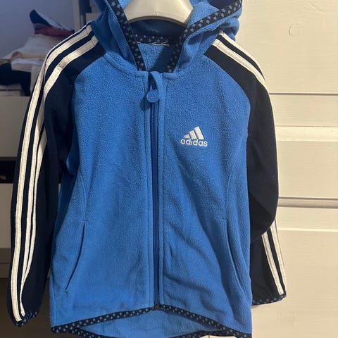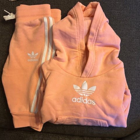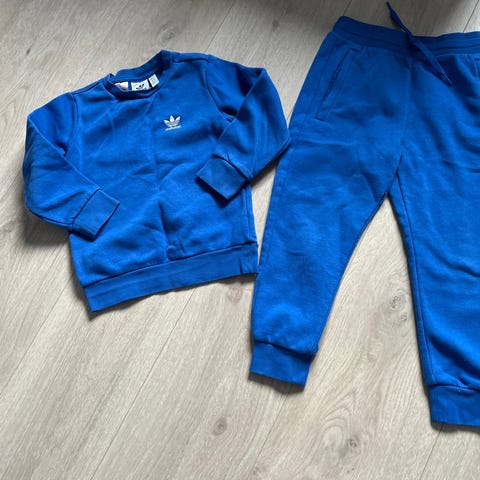 Adidas joggedress for barn i størrelse 68 (3-6 mnd) Sett med genser og bukse i blå farge med hvit Adidas-logo og klassiske striper på buksen. Mykt og behagelig materiale egnet til hverdagsbruk og lett aktivitet for små barn. Svært lite brukt!