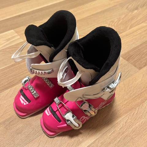 Lange alpinstøvler for barn i blå og oransje farge. Støvlene har fire spenner i metall for god justering og tilpasning rundt fot og legg. Myk og polstret innersko i svart materiale gir komfort og støtte. Sålen er merket med sålelengde 197 mm. Egnet til vanlig alpint bruk i alpinanlegg. Str. 18,5 i mondo og ca str 28, vanlig.