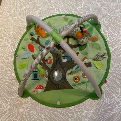 Den ultimate babygymmen! Fem leker følger med og de har ulike funksjoner som forskjellige lyder og speil. I tillegg er det speil på matten, løv som rasler og pipete blomst.