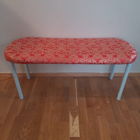 Benken er hel og fin. Jeg er ikke nøyaktig sikker på målene. Du finner den på ikea.