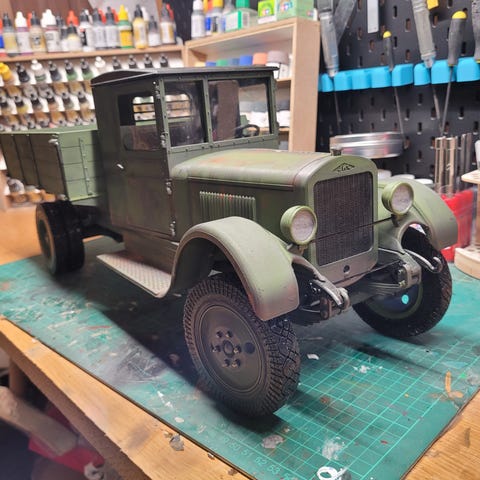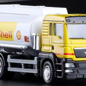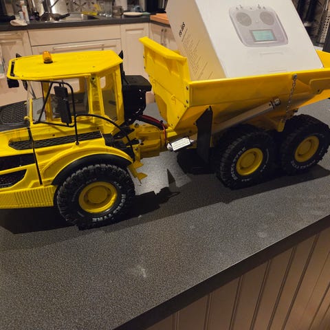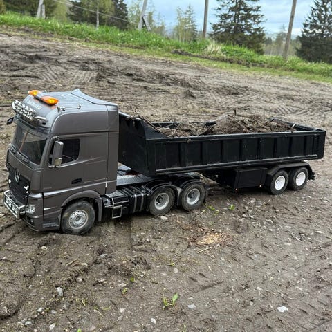 Lastebil i skala 1:14 med lasteplan med enkelte deler i metall, en krok og to uliike kloer. Modellen kjører framover/bakover og svinger høyre/venstre samt nedfellbare vegger på lasteplanet og tippefunksjon. Modellen har også lys og og lyd i tillegg til trestokker i plast . Like gøy for voksne som barn. Maskinen leveres komplett
