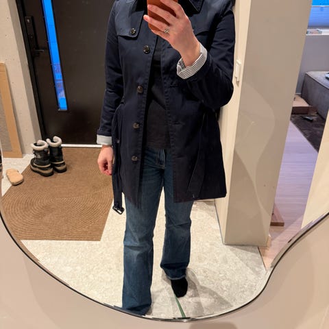 Stilen er trenchcoat med belte i livet, god passform og høy krage. Fin til mellomsesong.