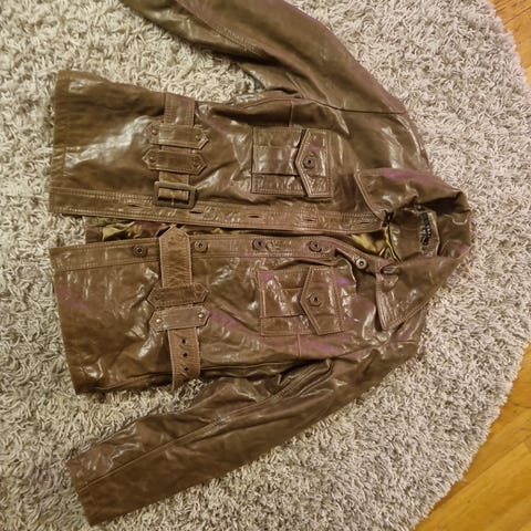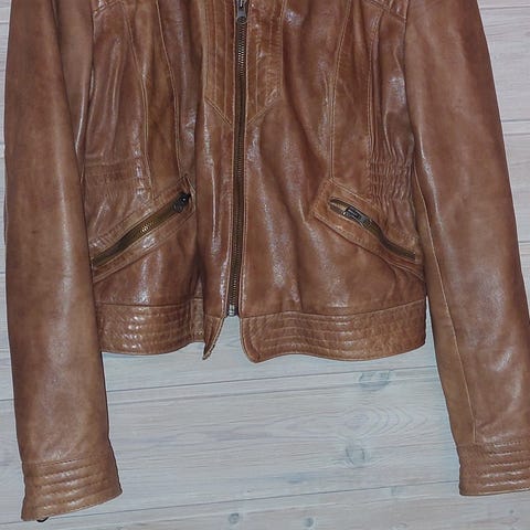 Meget pent brukt Tara skinnjakke/bikerjakke for dame i størrelse 36. Jakken er svart og laget i skinn, med glidelåslukking foran, glidelåslommer og glidelås på ermene. Fôret er i polyester. Passer som ytterjakke i overgangssesonger eller til hverdags- og penere antrekk der en enkel skinnjakke ønskes.