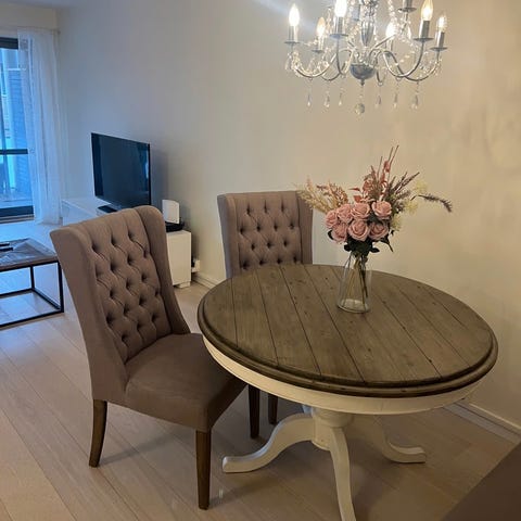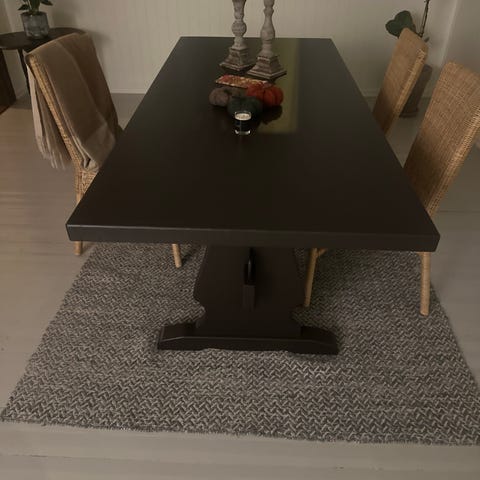 Fint og solid 10 år gammelt spisebord med 2 ileggsplater. Noen små bruksmerker, men har mange år igjen med god stemning rundt seg.
