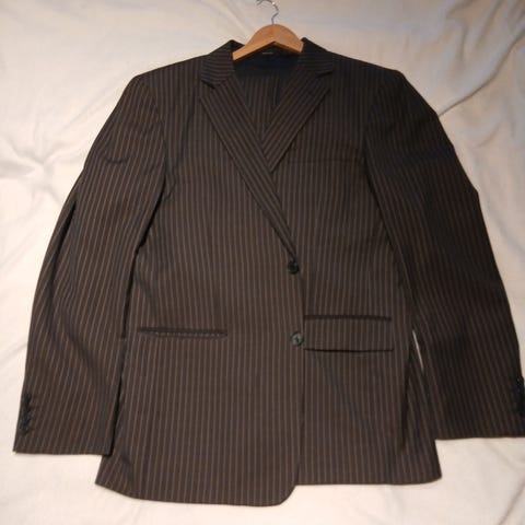 Jakken er ubrukt/som ny, av merket Batistini. God kvalitet på denne. Lengde målt fra nakken og ned 73 cm , bredde målt bryst front 43 cm., lengde arm 59 cm. Tilsvarende str. S-M. Farge svart med smale striper, innerfór lysgrå silke. Flere lommer innside.