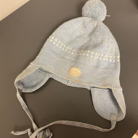 Lillelam lue i ull for barn, unisex, i størrelse 80. Lua er blå og strikket i ull, med øreklaffer, knytebånd og dusk på toppen. Passer til hverdagsbruk og uteaktiviteter i kjøligere vær.