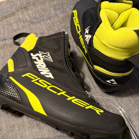 Fischer XJ Sprint langrennsstøvler i størrelse EU 35. Modellen er laget for klassisk langrenn og har overdel i syntetisk materiale med glidelås og høy ankelmansjett. Sålen er tilpasset NNN-kompatible bindinger. Fargekombinasjon svart og gul med Fischer-logo på sidene.
