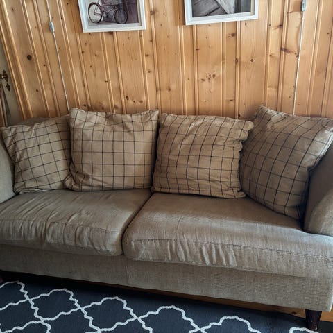 2+3 seter sofa.Farge beige/ brun i stoffet og armlener og underdel i brunt semsket skinn.Hel og fin.