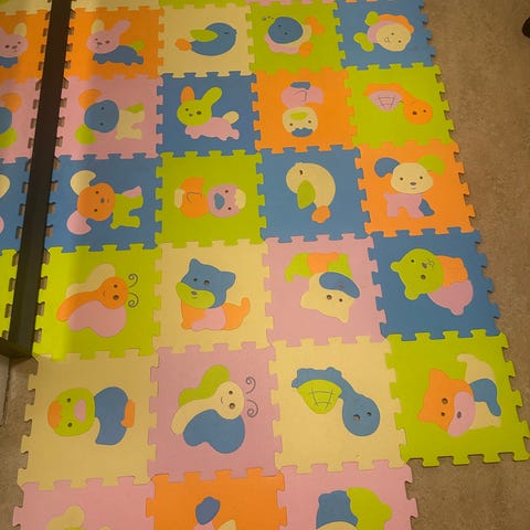 Skummatte med dyremotiv i flere farger. Matten består av sammenføynbare ruter med ugler og elefanter i ulike farger og mønstre. Egnet som leke- og lekeplassmatte på gulv for barn, og gir et mykere underlag ved lek. 31x31