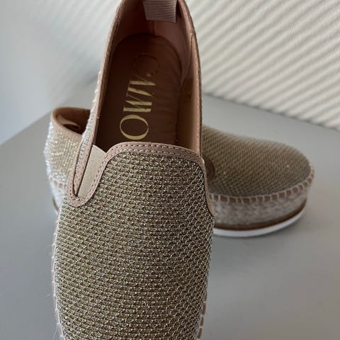 Espadrillos/båtsko/mokasiner fra Gaimo, jeg bruker vanligvis 41, men disse også passet meg. Semsket skinn i en pudderosa/beige farge!