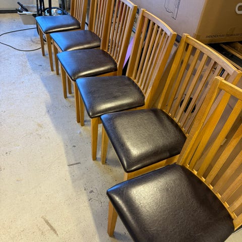 ⚠️ To av stolene har en rift/hull på undersiden av setet (ikke synlig ved vanlig bruk). Dette påvirker ikke komfort eller stabilitet.