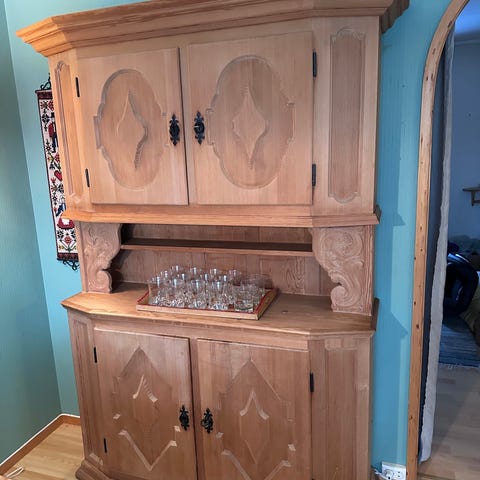 Har stått til glede og pynt i spisestuen med penglass og pent servise.