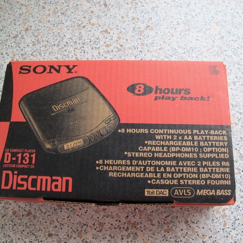 Selger en vintage Sony Discman D‑E301, en klassisk bærbar CD‑spiller fra 1990‑tallet.