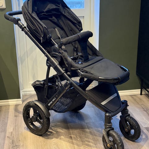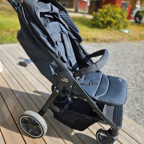 Britax sportsvogn i lilla og svart. Vognen har fire hjul, justerbar kalesje og liggestilling i setet. Den har frontbøyle, oppbevaringskurv under setet og håndtak i bueform. Vognen kan legges sammen for enklere oppbevaring og transport. Passer til ett barn.