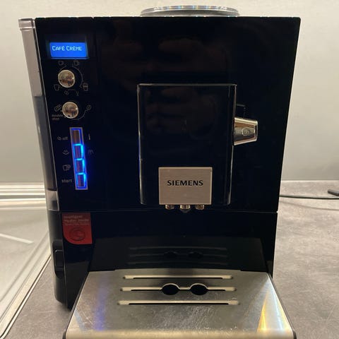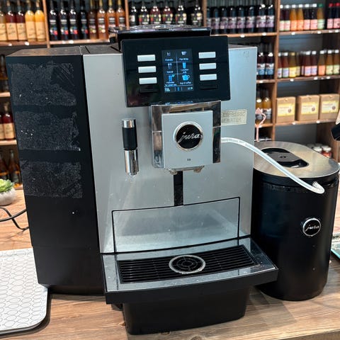 Fronten har display med meny for ulike kaffedrikker som espresso, kaffe og melkebaserte drikker, samt varmt vann. Maskinen har dyse på siden for melkeskum og/eller varmt vann.