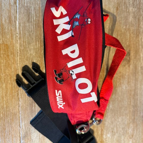Sele med mageveske i blå og rød tekstil. Topp til de første turene i bakken! Lite brukt.
