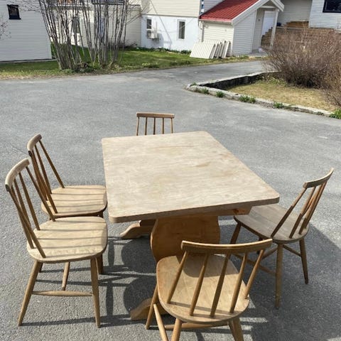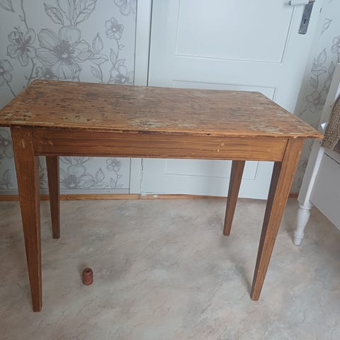 Selger et solid og sjarmerende kjøkkenbord med flott patina. Bordet har et rustikt uttrykk og bærer preg av alder og bruk, noe som gir det en unik og autentisk stil. Perfekt til hytte, landlig kjøkken, verksted eller som et oppussingsprosjekt.