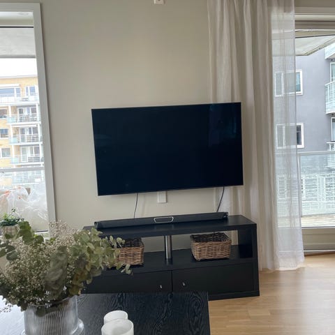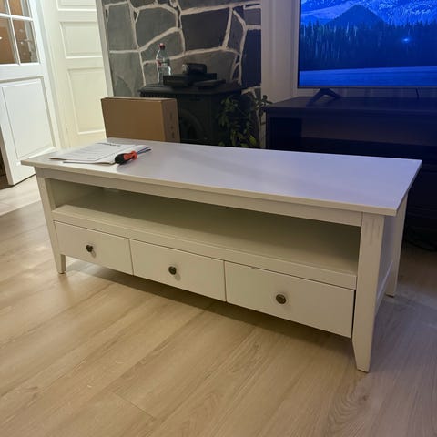Skeidar TV-benk i hvit utførelse. Benken har en åpen hylle under topplaten som egner seg for medieutstyr, samt tre skuffer med knotter i front for oppbevaring. Passer som TV-møbel eller lav oppbevaringsbenk i stue eller oppholdsrom. Designet er enkelt og funksjonelt med rette linjer og ben som løfter møbelet fra gulvet.