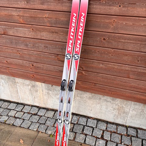 Madshus 120 MG langrennsski med tilhørende staver. Skiene har lengde 120 cm og er klassiske langrennsski med smørefritt mønster under sålen (MG).