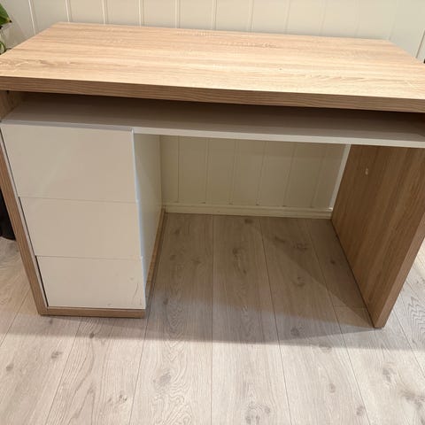 Godt brukt skrivepult med én skuff, og et skap. Pulten har noe slitasje langs fronten og sidene, i tillegg til to skruehull på innsiden etter en vegghengt søppelbøtte. Det er absolutt mye pult igjen her.